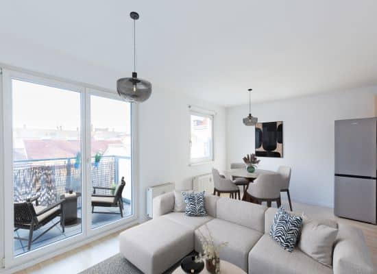 Die Wohnung vermittelt eine gemütliche Atmosphäre und der große Fensterbereich lässt viel Tageslicht herein. Vom Wohn-Essbereich aus gelangen Sie auf Loggia/Balkon, dieser Bereich hat ca. 7m². Die schöne Einbau-Küche beinhaltet alle Geräte. Das Vorzimmer bietet viel Stauraum und das großzügige Schlafzimmer ermöglich die Anbringung eines begehbaren Schrankraums. Vom Schlafzimmer gelangen Sie zum Badezimmer, welches mit Badewanne, Waschmaschinen-Anschluss und Fenster ausgestattet ist. Die Toilette verfügt über ein Handwaschbecken. Die Wohnung hat eine Ost/West-Ausrichtung. Auf beiden Seiten haben Sie kein unmittelbares Gegenüber. Zur Wohnung gehört ein Kellerabteil mit ca. 2,4m².
